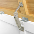 A metal hinge mechanism connects a wooden cabinet door to its frame, stabilizing the door in an open position.