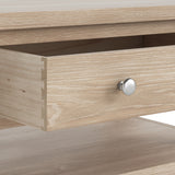 With a large drawer, this natural coffee table offers ample storage, while the metallic silver knobs contribute to its elegant appearance. The lower shelf is ideal for keeping living room essentials at hand or displaying cherished items.