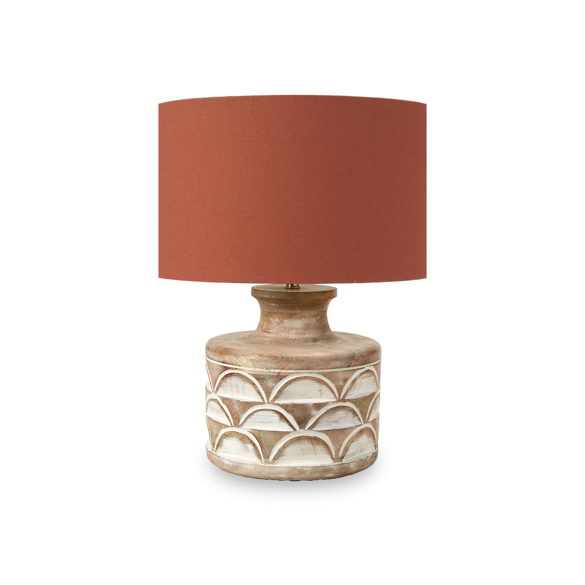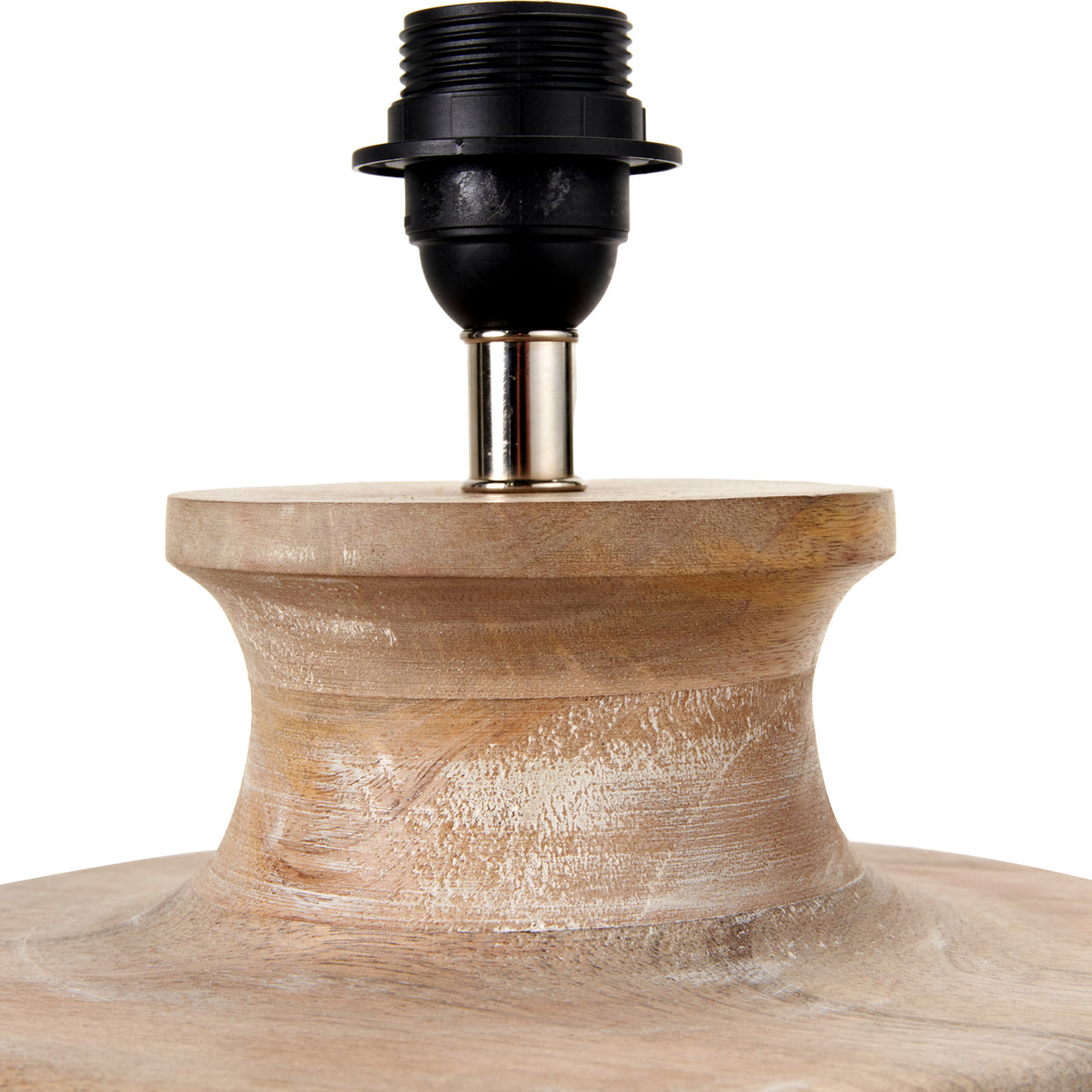 The Kingsbury White Wash Large Carved Wood Table Lamp features intricate carved wood. Its curved dome-shaped mango wood base highlights the wood's natural grain, making it a timeless and rustic-inspired option.