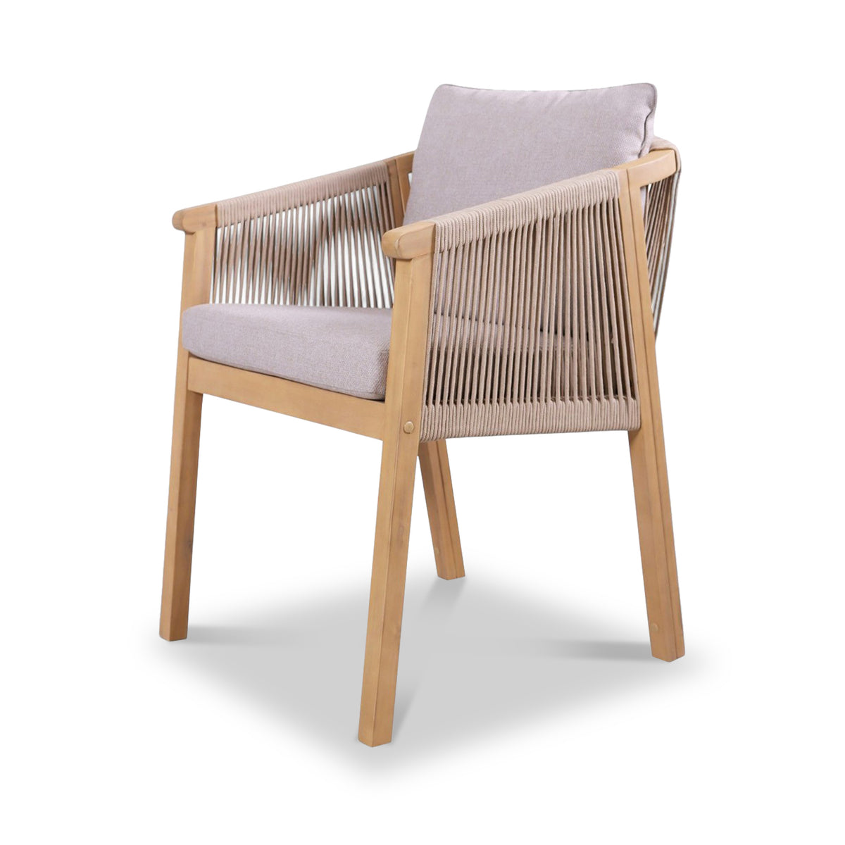 The light teak finish of the Acacia wood pairs beautifully with the neutral beige rope weave, creating a cohesive look that blends harmoniously with existing garden elements. This versatile set works wonderfully in both covered areas, or as a standalone feature on an open patio. Perfect for contemporary urban, coastal, and modern farmhouse designed gardens.