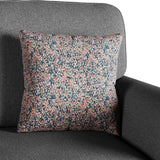 A grey fabric sofa arm, with a patterned cushion resting against its backrest.